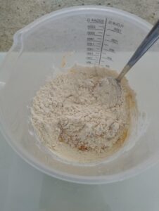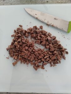 Vervolgens voeg je de bloem toe en meng je tot de bloem helemaal is opgenomen in het deeg. Snijd de chocolade in kleine stukjes en voeg dit ook toe aan het deeg.