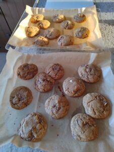 Iets wat ook handig is aan chocolate chip cookies: je hoeft er helemaal geen speciale chocolate chips voor te kopen. Eigenlijk kun je er gewoon elke chocolade in gebruiken die nog ergens in je kast ligt. Ik maak me daar wel eens schuldig aan, dat als ik net nieuwe chocolade heb er dan aan begin om deze dan in vergetelheid te laten belanden onder al de andere dingen in de kast. In deze batch gingen er zelfs stukjes suikerbonen bij want eerlijk, wanneer eet je die anders ooit op? Het resultaat zijn koekjes die een beetje anders zijn dan de klassieke versie, maar nog altijd even gezellig en onweerstaanbaar.