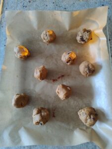Maak gelijke bolletjes van het deeg en plaats deze met voldoende afstand op een bakplaat.