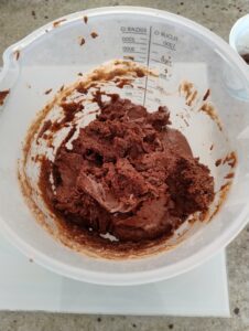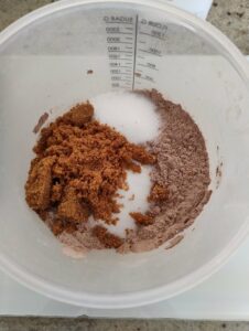 Meng de bloem, bakpoeder, baking soda en cacao samen. Voeg hier nadien de 2 soorten suiker bij en meng dit goed door elkaar.