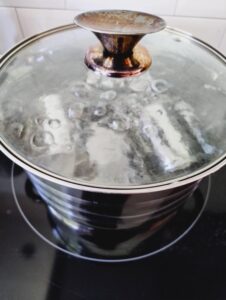 Leg je blikjes in je pot met water. Het water hoeft nog niet te koken, zo kun je veilig je blikjes in het water leggen. Het belangrijkste is om ervoor te zorgen dat op elk moment van het kookproces je blikjes volledig onder water blijven staan. We willen geen ontploffingsincidenten. 💣 Dit betekent niet dat je met argusogen 3 uur naast je kookpot moet blijven staan. Als je elk halfuur het waterniveau even checkt, komt het helemaal goed.
