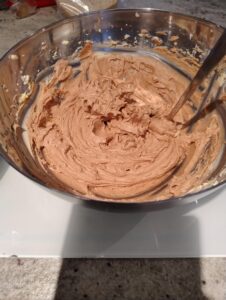 Vervolgens giet je er de wat afgekoelde chocolade bij en klop je dit nog eens goed door.