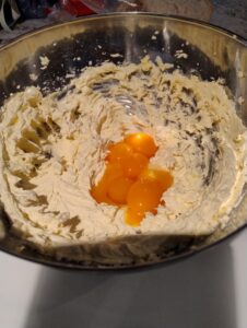 Terwijl de chocolade wat afkoelt, meng je de zachte boter en de poedersuiker. Klop dit tot je een romig geheel krijgt. Voeg hier vervolgens ook de eigelen aan toe. Mix dit tot alle eigelen zijn opgenomen.