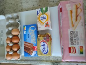 De basis bestaat uit boudoirkoekjes, met daartussen een zachte chocoladevulling die een beetje doet denken aan chocolademousse, maar dan anders. In plaats van room wordt er boter gebruikt, wat zorgt voor een rijkere, vollere smaak en een stevigere textuur. Midden in de vulling zit nog een extra laag boudoirkoekjes verstopt, wat voor een fijne afwisseling zorgt in texturen.