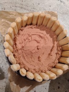 Wil je bij het plaatsen van de boudoirkoekjes tegen de rand van de springvorm niet het risico nemen op een domino effect? Dan heb je enkele opties. Ofwel snijd je het topje van de koekjes af zodat je ze kunt neerzetten op een platte kant. Ofwel leg je op de bodem de koekjes volledig tot aan de randen en smeer je hier bovenop langs de rand al een klein laagje vulling zodat je koekjes aan de rand een beetje meer grip hebben. Ik heb het zonder gedaan en heb het risico van een domino val erbij genomen en ik heb maar 1 keer gevloekt. Dat lijkt me heel schappelijk. 💁♀️