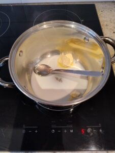 Terwijl de cake afkoelt kan je de witte chocolade ganache maken. Verwarm de melk en de boter in een pannetje tot het begint te koken. Haal van het vuur en doe hier de chocolade in. En blijf goed roeren tot de chocolade is gesmolten. Laat de ganache afkoelen tot op lichaamstemperatuur.