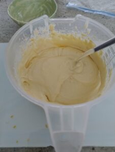Rasp en pers 2 biocitroenen. En voeg dit toe aan het beslag. Meng even goed door. Voeg hier vervolgens ook de afgekoelde gesmolten boter aan toe.