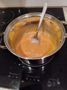 Laat de lichtbruine suiker volledig oplossen in de boter. Belangrijk aandachtspunt: zorg er voor dat het een homogeen mengsel wordt. Je mag niet nog een laagje boter hebben rondom. Alles moet mooi vermengd zijn. Hiervoor mag je het mengsel laten pruttelen.