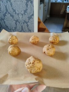 5. Maak vervolgens met een theelepel hoopjes speculaaspasta en plaats deze in de diepvries terwijl je koekjesdeeg in de koelkast rust voor een uurtje.