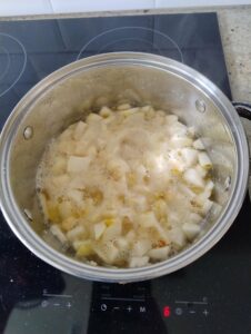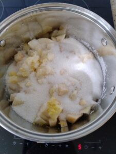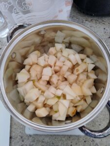 2. Schil de peren en snijd ze in kleine stukjes. Doe ze in een kookpot.