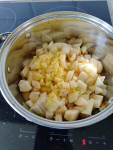 3. Rasp de gember en voeg toe aan de peren. Voeg ook de suiker, de citroenrasp en -sap en het water toe.