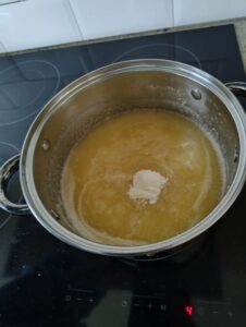 5. Zwier de staafmixer erdoor om alles fijn te mixen. Voeg vervolgens de agar agar toe en laat nog 2 minuten doorkoken.