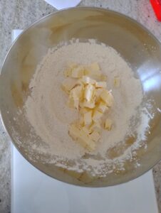 Meng de suiker en de bloem en voeg vervolgens de koude boter toe in blokjes. Meng met je handen tot de ingrediënten samenkomen in een deegbal. Laat het deeg 30 minuten tot 1 uur rusten in de koelkast.