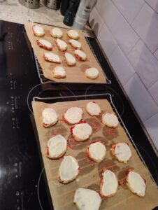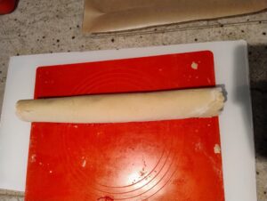 Snijd de rol in stukjes van ongeveer 1 cm breed. En plaats deze op de bakplaat. Ze hoeven niet super ver van elkaar te liggen aangezien deze koekjes niet gaan uitlopen.