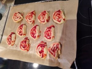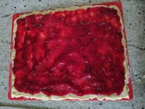 Rol het deeg uit tot een rechthoek van 38 x 30 cm. Besmeer dit met de afgekoelde veenbessenconfituur. En rol op. Leg de rol ook weer 30 minuten tot 1 uur in de koelkast, zodat wanneer ze in de oven gaan ze goed hun vorm behouden.
