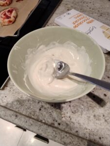 Als de koekjes zijn afgekoeld, smelt 100 gram witte chocolade in een microgolfoven veilig kommetje. Doe dit telkens 30 sec op 600 watt. Herhaal dit 2-3x, roer telkens een tijdje goed door zodat ze warmte zich goed kan verspreiden door de chocolade en deze niet aanbrandt want witte chocolade is niet de gemakkelijkste om te smelten.