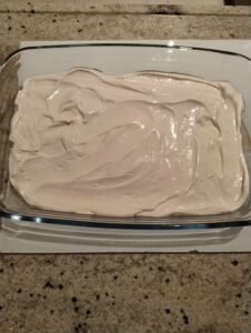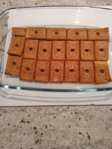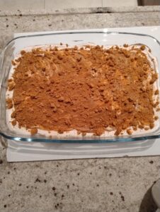 Smelt de 105 gram speculaaspasta in de microgolfoven en verspreid deze over de laag van het mascarponemengsel. Verkruimel hier vervolgens 4 speculaaskoekjes over. Plaats een nachtje in de koelkast.