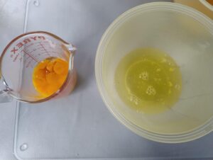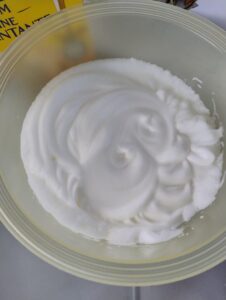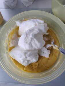 Voeg de opgeklopte eiwitten toe. ‘Vouw’ deze onder het mengsel om de lucht er niet uit te kloppen.
