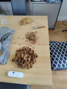 Terwijl het deeg rust kan je het walnoten/kaneel/karamel mengsel maken. Als je net als mij ongepelde walnoten hebt en ook geen notenkraker. Have fun! 😅