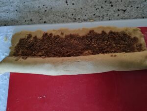 Rol het deeg uit tot een rechthoek van 38 x 30 cm. Besmeer dit met het walnotenmengsel. En rol op. Leg de rol ook weer 30 minuten -1 uur in de koelkast, zodat wanneer ze in de oven gaan ze goed hun vorm behouden.