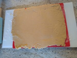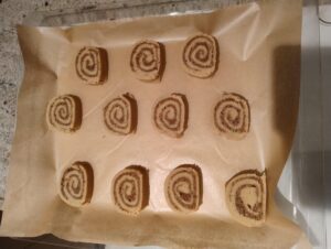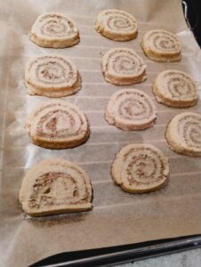 Snijd de rol in stukjes van ongeveer 1 cm breed. En plaats deze op de bakplaat. Ze hoeven niet superver van elkaar te liggen aangezien deze koekjes niet gaan uitlopen.